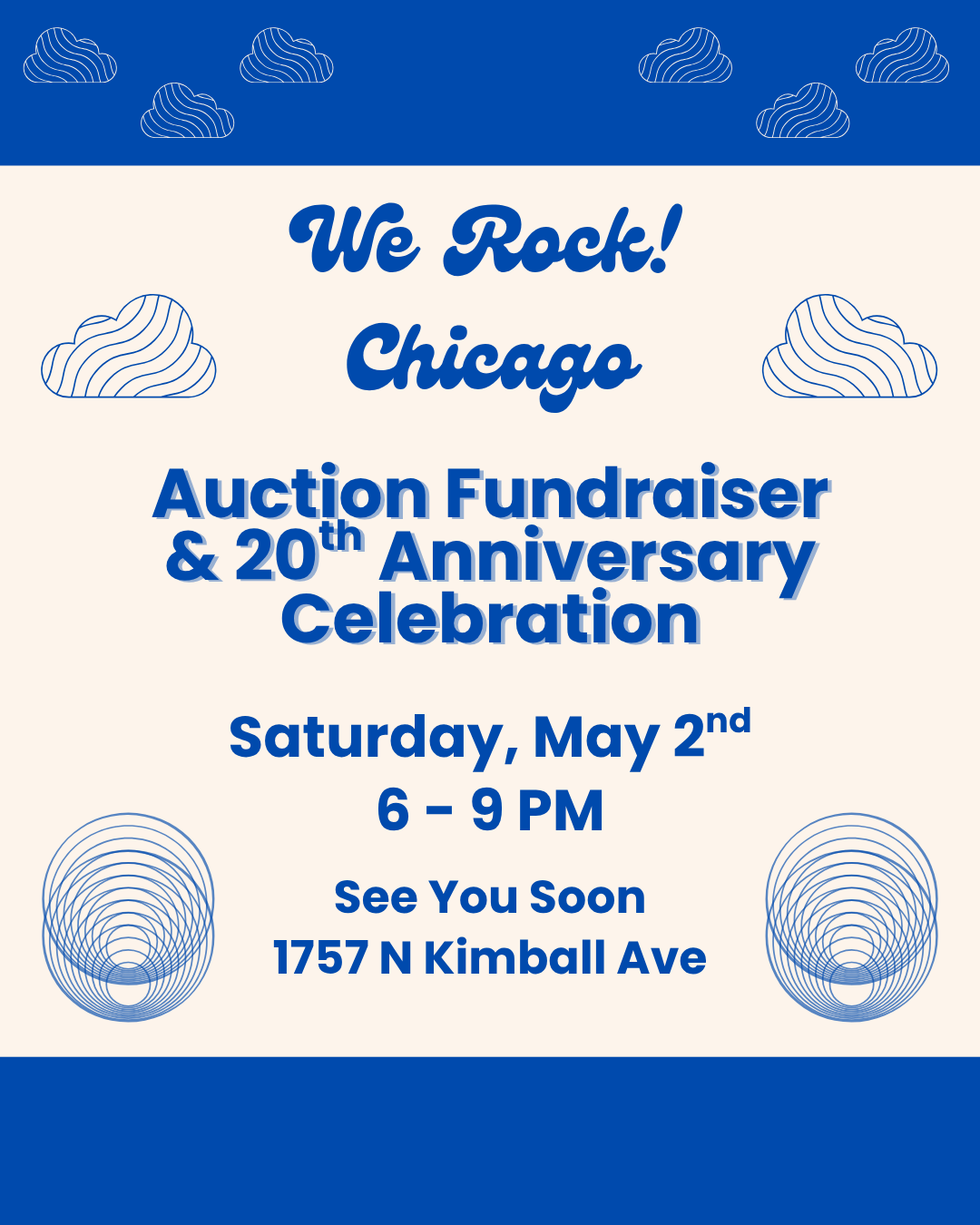 We are celebrating 20 years since our first camp season in 2006 and hope to raise $20,000 to support our unique music and social justice education programs. Join We Rock! Chicago at our upcoming auction fundraiser on Saturday, May 2nd from 6 β 9 PM at See You Soon for a night of music, tasty bites, drinks, and an incredible silent auction all in support of empowering youth through music!